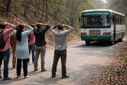 सुनसान सड़क पर खड़ी बस, चालक फरार; सिर पर हाथ रखे परेशान खड़े यात्री