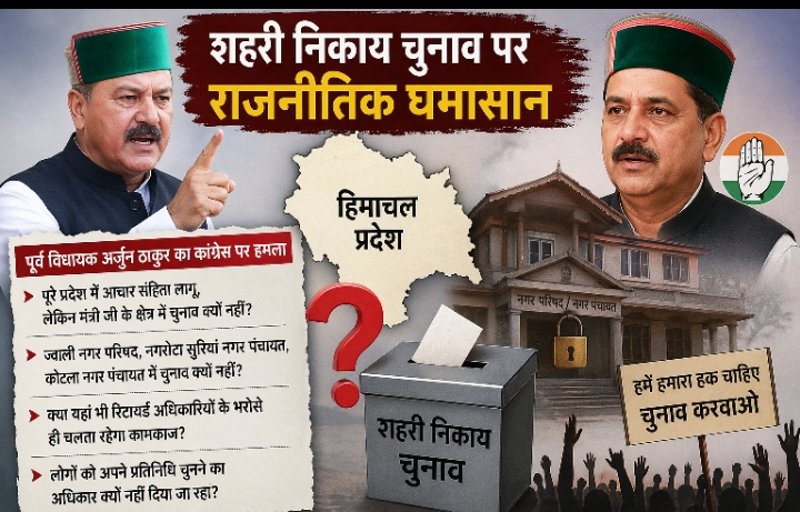 पूर्व विधायक अर्जुन ठाकुर ने सोशल मीडिया के माध्यम से कांग्रेस सरकार पर सीधा निशाना साधते हुए गंभीर सवाल खड़े किए हैं। उन्होंने अपने बयान में कहा कि जब प्रदेश के अधिकांश शहरी निकायों में चुनाव प्रक्रिया शुरू हो चुकी है, तो फिर कृषि मंत्री चौधरी चंद्र कुमार के विधानसभा क्षेत्र के अंतर्गत आने वाले ज्वाली नगर परिषद, नगरोटा सुरियां नगर पंचायत और कोटला नगर पंचायत में चुनाव क्यों नहीं कराए जा रहे हैं।