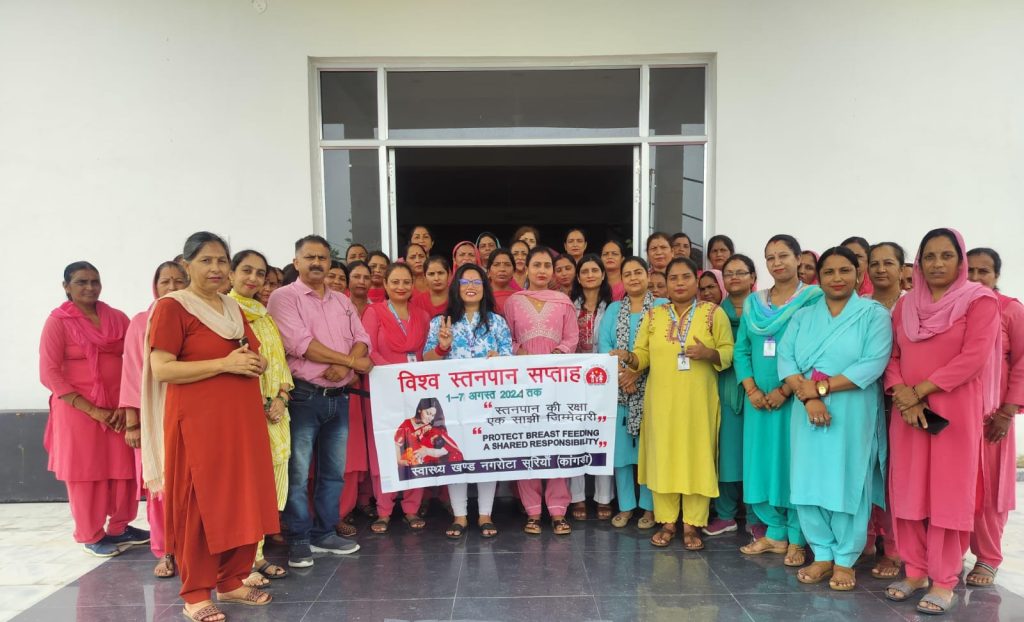 खंड चिकित्सा अधिकारी नगरोटा सुरियाँ डॉ अमन दुआ के सौजन्या से सामुदायिक स्वास्थ्य केंद्र नगरोटा सुरियाँ में स्वास्थ्य प्रयवेक्षक सुमन कुमारी और सुनीता देवी की अध्यक्षता में विश्व स्तनपान सप्ताह दिवस मनाया गया