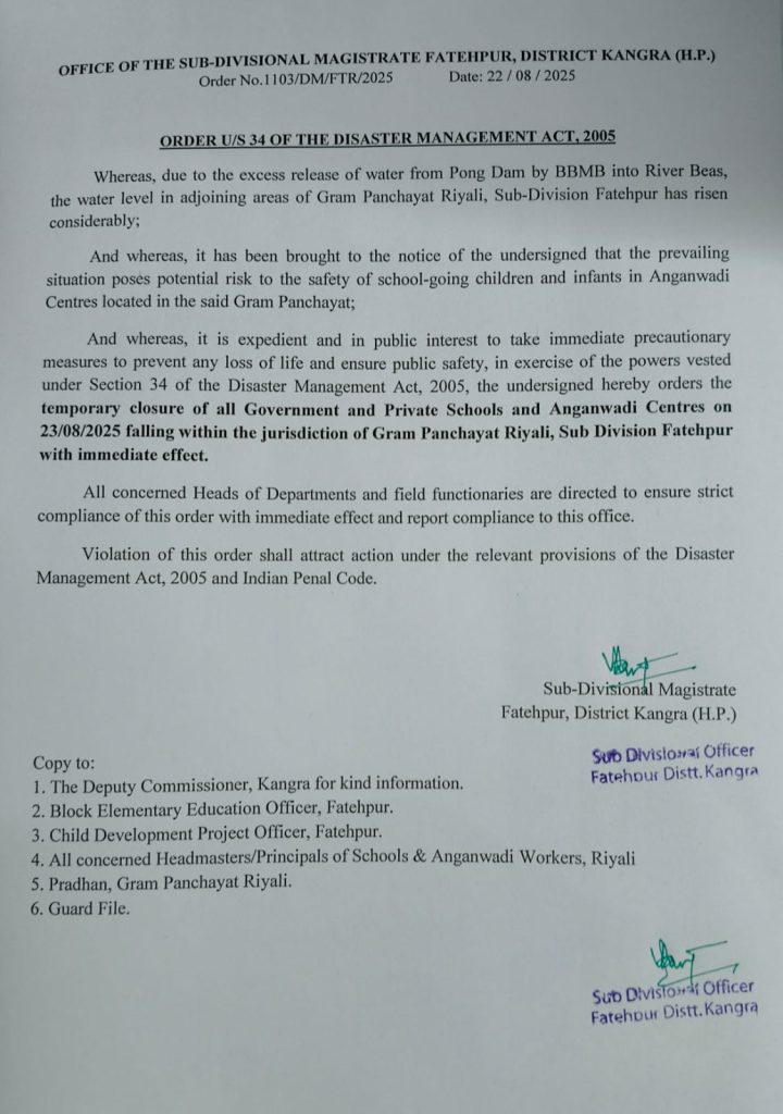 पौंग बांध से लगातार जलप्रवाह जारीजल शक्ति विभाग के अनुसार, भारी बारिश के कारण बांध में जलस्तर बढ़ गया है, जिसके चलते जल छोड़ना आवश्यक हो गया। यह प्रक्रिया नियंत्रित ढंग से की जा रही है, लेकिन नीचे बसे क्षेत्रों पर इसका प्रभाव स्वाभाविक रूप से देखा जा रहा है।