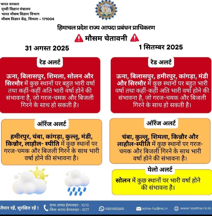 यह मौसम पूर्वानुमान हिमाचल प्रदेश के लिए बेहद अहम है। इसे समाचार पत्र शैली में इस प्रकार लिखा जा सकता है:—हिमाचल में भारी बारिश का अलर्ट, स्थानीय बाढ़ की आशंकाशिमला। मौसम विभाग ने हिमाचल प्रदेश में आगामी दिनों के लिए भारी बारिश का पूर्वानुमान जारी किया है। प्रदेश के अधिकांश क्षेत्रों में 90 से 100 प्रतिशत तक वर्षा की संभावना जताई गई है।जानकारी के अनुसार न्यूनतम तापमान 14 डिग्री सेल्सियस से 16 डिग्री सेल्सियस के बीच रहने का अनुमान है। वर्षा की मात्रा 12 मिलीमीटर से बढ़कर 25 मिलीमीटर तक पहुंच सकती है। वहीं, आर्द्रता का स्तर 91 प्रतिशत से अधिक रहने की संभावना है, जो वातावरण में भारी नमी का संकेत है।मौसम विभाग ने चेतावनी दी है कि लगातार बारिश के चलते कुछ स्थानों पर स्थानीयकृत बाढ़ की स्थिति उत्पन्न हो सकती है। इस कारण यात्रियों और स्थानीय निवासियों को सावधानी बरतने की सलाह दी गई है। विभाग ने लोगों से अपील की है कि वे यात्रा के दौरान मौसम पूर्वानुमान पर नज़र रखें और भारी बारिश के समय अनावश्यक रूप से बाहर निकलने से बचें।
