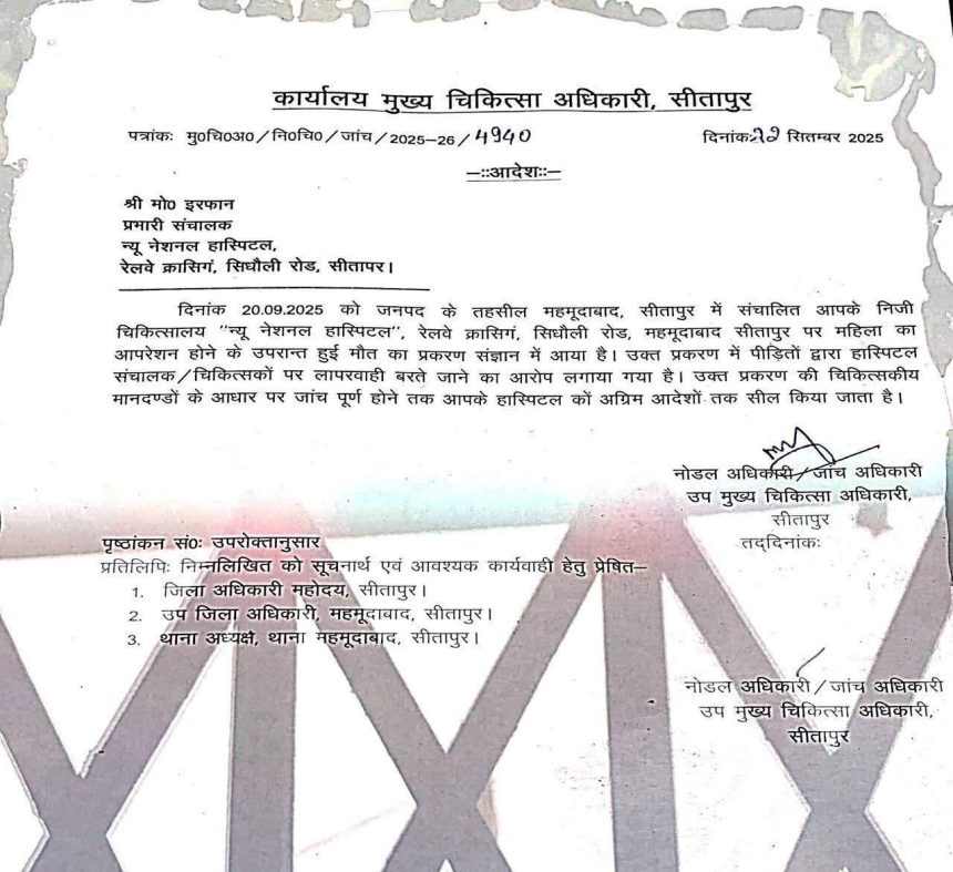 तहसील महमूदाबाद में संचालित न्यू नेशनल हॉस्पिटल, रेलवे क्रॉसिंग, सिधौली रोड पर महिला की मौत के मामले ने तूल पकड़ लिया है। बताया जा रहा है कि 20 सितंबर 2025 को अस्पताल में महिला का ऑपरेशन किया गया था, जिसके बाद उसकी मौत हो गई।
