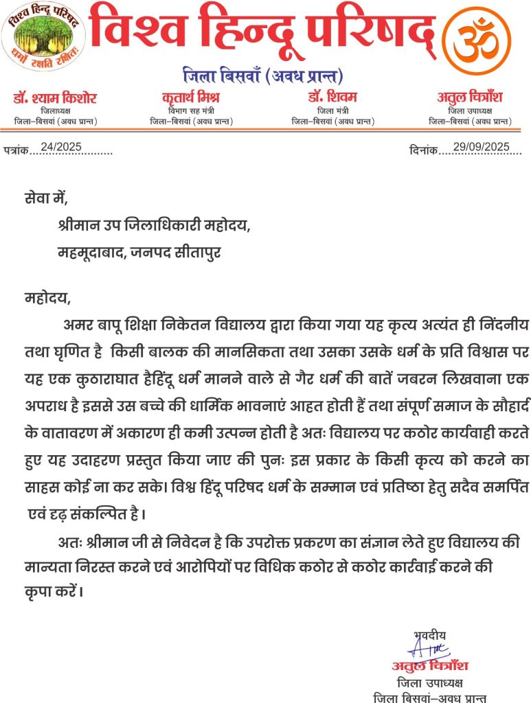 विश्व हिंदू परिषद ने इस घटना को “अत्यंत निंदनीय एवं घृणित” बताते हुए उप जिलाधिकारी महमूदाबाद को एक पत्र सौंपा है। संगठन ने कहा कि यह कृत्य एक बालक की मानसिकता और उसके धर्म के प्रति विश्वास पर कुठाराघात है।