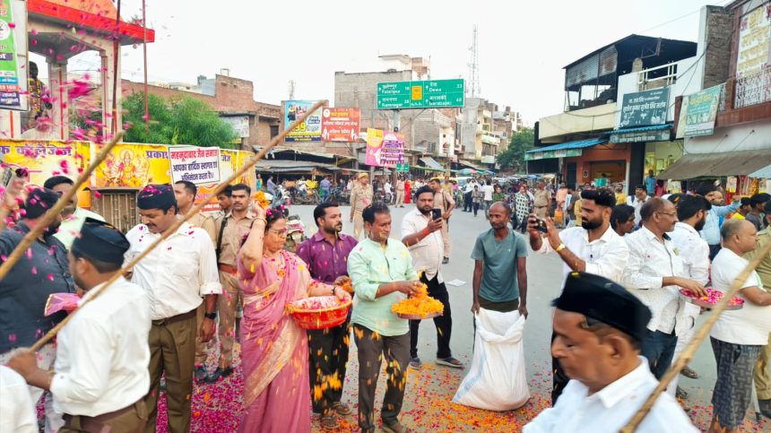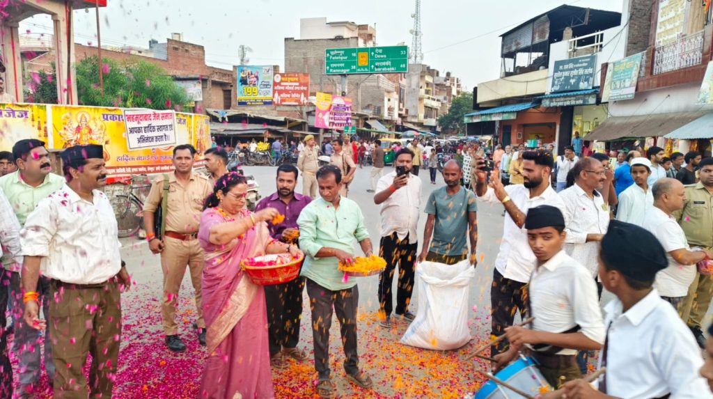 इस अवसर पर पूर्व गणवेश में सुसज्जित स्वयंसेवक अनुशासित पंक्तियों में कदमताल करते हुए आगे बढ़े, जिससे नगरवासियों में देशभक्ति और संगठन भावना का संदेश गया।रामकुंड चौराहा पहुंचने पर जैन समाज अध्यक्ष अनुज जैन ने अपने सहयोगियों के साथ स्वयंसेवकों का गर्मजोशी से स्वागत किया और उन पर पुष्प वर्षा की। पुष्प वर्षा की पूरी व्यवस्था जैन समाज की ओर से की गई थी।