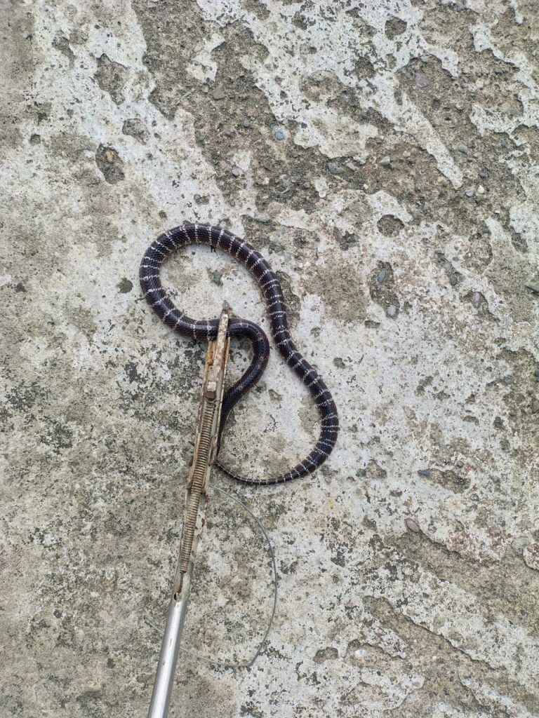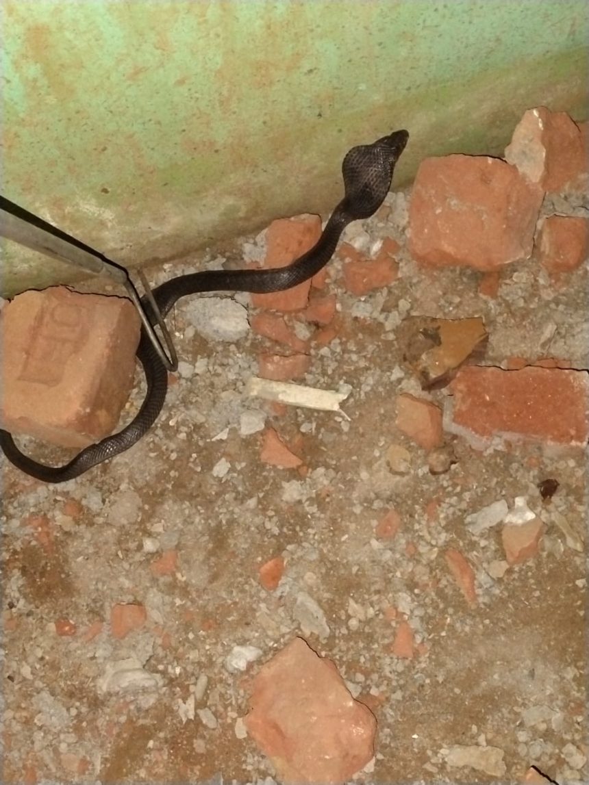 फोटो – विकास सन्याल एवं इन्सेट- पकड़ा गया सांप।