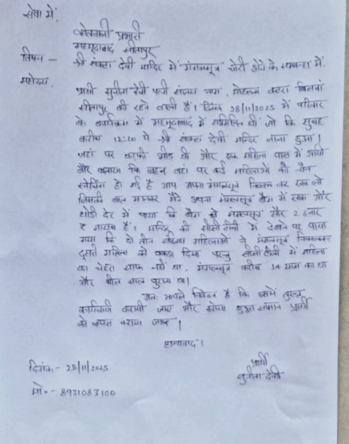 श्री संकटा देवी मंदिर परिसर में गुरुवार को भीड़भाड़ का फायदा उठाकर अज्ञात महिलाओं द्वारा मंगलसूत्र चोरी किए जाने का मामला सामने आया है। बिसवां के मोहल्ला कटरा निवासी सुनीता देवी पत्नी संजय नाग ने पुलिस को दी तहरीर में बताया कि वह 28 नवंबर 2025 को एक पारिवारिक कार्यक्रम में शामिल होने महमूदाबाद आई थीं। इसी दौरान दोपहर लगभग 12:20 बजे वह श्री संकटा देवी मंदिर दर्शन करने पहुंचीं