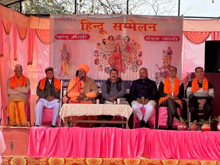 राष्ट्रीय स्वयंसेवक संघ के शताब्दी वर्ष के उपलक्ष्य पर जवाली के अधीन महाराणा प्रताप भवन लब में रविवार को विराट हिन्दू सम्मेलन का आयोजन किया गया जिसमें अद्वैत स्वरूप संन्यास आश्रम भरमाड के संचालक महंत राघवानंद महाराज ने बतौर मुख्यातिथि शिरकत की जबकि आरएसएस प्रांत गौ सेवा प्रमुख बालकृष्ण शर्मा ने बतौर मुख्य वक्ता शिरकत की। कार्यक्रम संयोजक भीखम सिंह पगड़ोत्रा सहित लोगों द्वारा मुख्यातिथि व वक्ता का जोरदार स्वागत किया गया। भजन मंडली द्वारा कीर्तन किया गया। मंदिर में हवन यज्ञ किया गया। तदोपरांत ध्वजारोहण किया गया। मुख्यातिथि ने भारत माता के चित्र समक्ष ज्योति प्रज्वलित की। अद्वैत स्वरूप संन्यास आश्रम भरमाड के संचालक महंत राघवानंद महाराज ने कहा कि सनातन से बड़ा कोई धर्म नहीं है। सनातन धर्म मानवता का संदेश देने वाला है। उन्होंने कहा कि युवाओं व हिंदुओं को जागृत करने के लिए ऐसे आयोजन किए जा रहे हैं। उन्होंने कहा कि वर्तमान समय धर्म और संस्कृति की रक्षा का स्वर्ण अवसर है। समाज के प्रत्येक व्यक्ति को स्वयं जागृत होकर दूसरों को भी जागृत करना चाहिए। इस मौके पर भाजपा नेता संजय गुलेरिया, भाजपा जिला उपाध्यक्ष रवि कुमार, मंडलाध्यक्ष डॉक्टर राजिंदर सिंह, महामंत्री सुलक्षण शर्मा कौल, भाजयुमो जिला महामंत्री शिंटू ठाकुर, चैन सिंह पगड़ोत्रा सहित काफी संख्या में लोग मौजूद रहे।