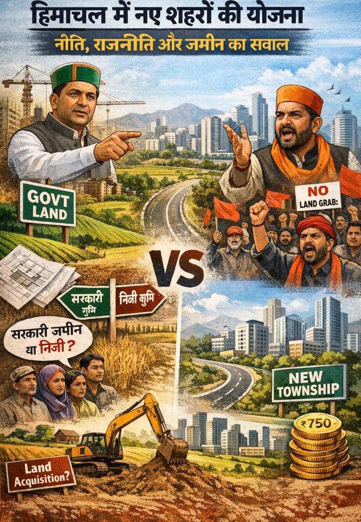 हिमाचल में नए शहरों की योजना : नीति, राजनीति और जमीन का सवालहिमाचल प्रदेश सरकार द्वारा कांगड़ा के लंज, सिरमौर के सराहन और औद्योगिक क्षेत्र बद्दी में हिमुडा के माध्यम से 10–10 हजार बीघा भूमि पर नए शहर बसाने की घोषणा ने प्रदेश की राजनीति को गर्मा दिया है। यह योजना केवल शहरी विकास का विषय नहीं रह गई, बल्कि भूमि अधिग्रहण, पारदर्शिता और राजनीतिक मंशा के प्रश्नों से जुड़कर एक बड़े सार्वजनिक विमर्श में बदल गई है।