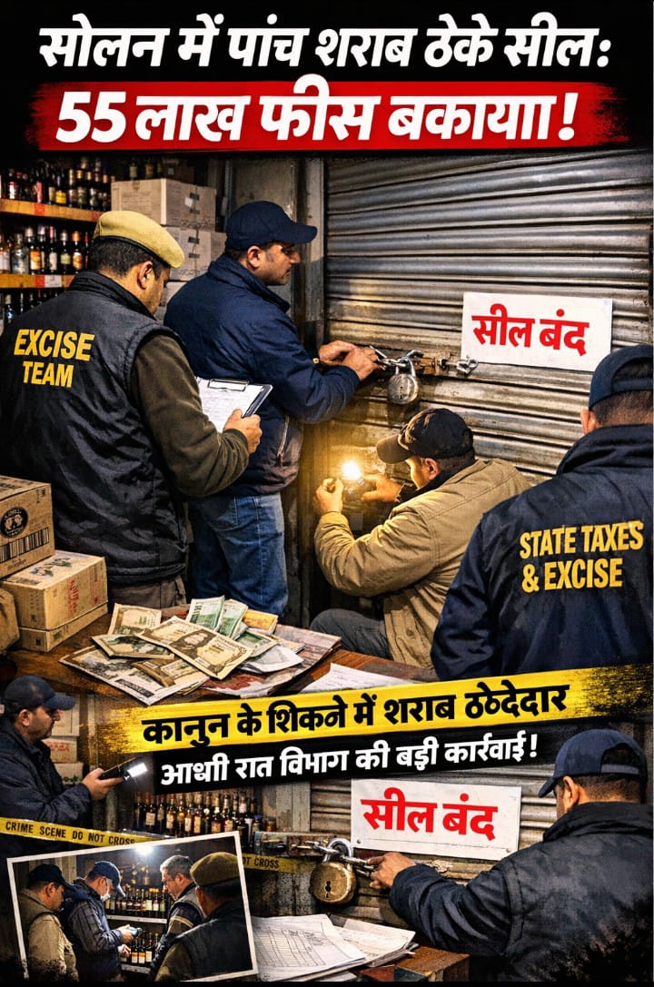 सोलन शहर में मंगलवार देर रात राज्य एवं आबकारी विभाग ने ऐसा शिकंजा कसा कि शराब कारोबारियों में हड़कंप मच गया। विभाग की टीम ने शहर के अलग-अलग इलाकों में दबिश देकर पांच शराब ठेकों को मौके पर ही सील कर दिया। वजह साफ थी—करीब 55 लाख रुपये की मार्केट फीस लंबे समय से बकाया, लेकिन ठेका संचालकों ने न तो रकम चुकाई और न ही विभागीय नोटिसों को गंभीरता से लिया।