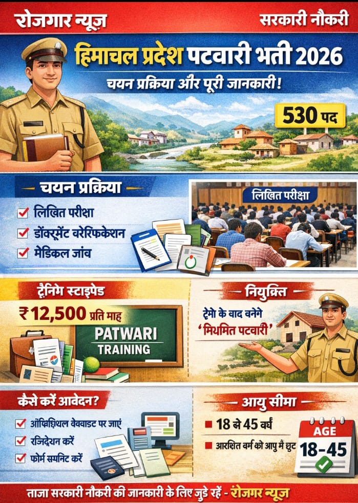 हिमाचल प्रदेश सरकार ने पटवारी पदों पर भर्ती निकाली है। इस भर्ती के तहत कुल 530 पद भरे जाएंगे। पटवारी भर्ती के लिए आवेदन प्रक्रिया चल रही है और आज आवेदन करने की अंतिम तिथि है। जिन उम्मीदवारों ने अभी तक आवेदन नहीं किया है, वे तुरंत आधिकारिक वेबसाइट पर जाकर आवेदन कर सकते हैं।अगर आप इस भर्ती के लिए आवेदन कर चुके हैं या करने की तैयारी में हैं, तो आपके लिए यह जानना बहुत ज़रूरी है कि पटवारी भर्ती में चयन कैसे होगा, परीक्षा किस तरह की होगी और नियुक्ति के बाद क्या लाभ मिलेंगे। नीचे पूरी जानकारी सरल शब्दों में दी जा रही है।