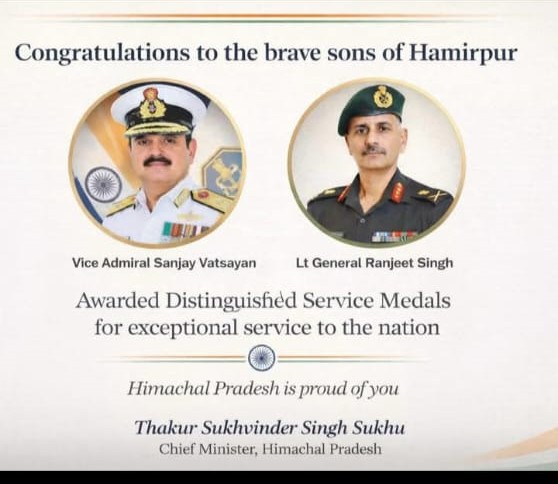 हमीरपुर जिले से संबंध रखने वाले वाइस एडमिरल संजय वात्स्यायन को परम विशिष्ट सेवा पदक तथा लेफ्टिनेंट जनरल रंजीत सिंह को अति विशिष्ट सेवा पदक से सम्मानित किया गया है। यह सम्मान न केवल हिमाचल प्रदेश बल्कि पूरे देश के लिए गौरव का विषय है।