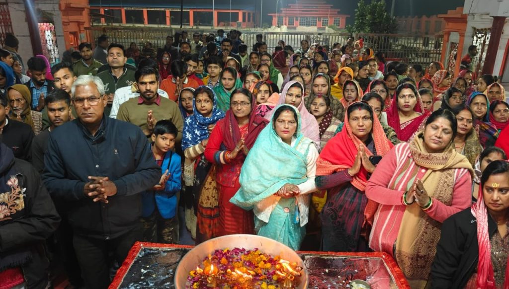 नगर के प्रसिद्ध श्री संकटा देवी मंदिर में माघ माह की पूर्णिमा के पावन अवसर पर रविवार की सायं भव्य सामूहिक आरती का आयोजन किया गया। इस धार्मिक आयोजन में सैकड़ों श्रद्धालु भक्तों ने सहभागिता कर वातावरण को भक्तिमय बना दिया। वाद्य यंत्रों की मधुर थाप, संगीतमय आरती और जयघोष से पूरा मंदिर परिसर गुंजायमान हो उठा।