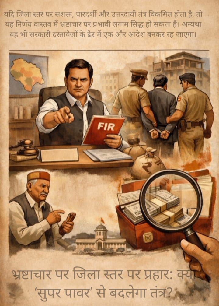 यदि जिला स्तर पर सशक्त, पारदर्शी और उत्तरदायी तंत्र विकसित होता है, तो यह निर्णय वास्तव में भ्रष्टाचार पर प्रभावी लगाम सिद्ध हो सकता है। अन्यथा यह भी सरकारी दस्तावेजों के ढेर में एक और आदेश बनकर रह जाएगा। अब निगाहें इस बात पर हैं कि प्रशासन इस नई शक्ति को व्यवस्था सुधार के औजार के रूप में उपयोग करता है या केवल औपचारिक कठोरता तक सीमित रखता है।
